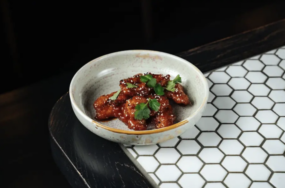Свиные ребра су-вид, соус BBQ, маринованная краснокачанная капуста, маринованная цветная капуста, кунжут