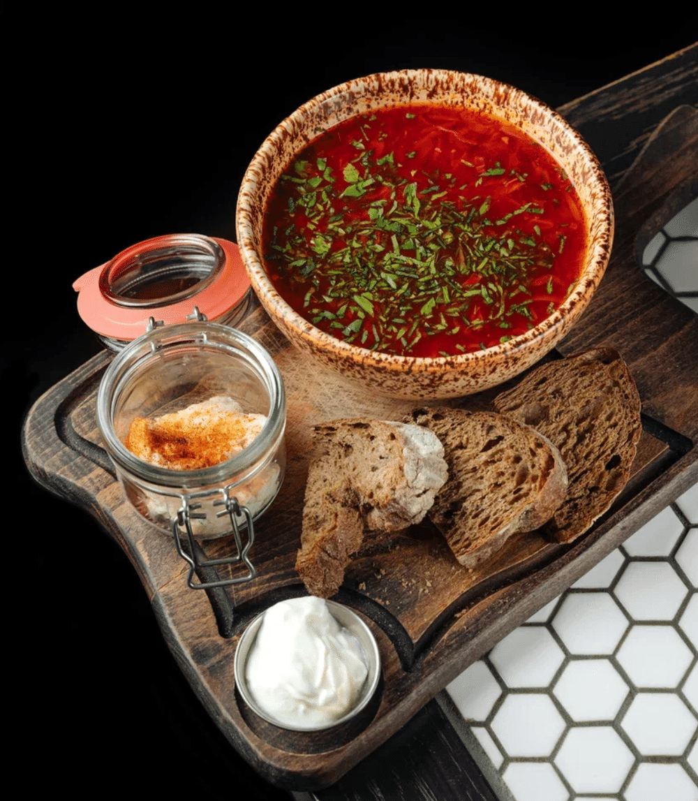 Бульон куриный, говядина отварная, свекла, морковь, капуста, лук репчатый, томатная паста, перуанский хлеб, сметана, копченый смалец (сало, чеснок, специи)