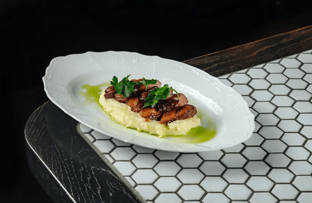 Утиная грудка, маринованная слива (соус хойсин, мед), картофельное пюре