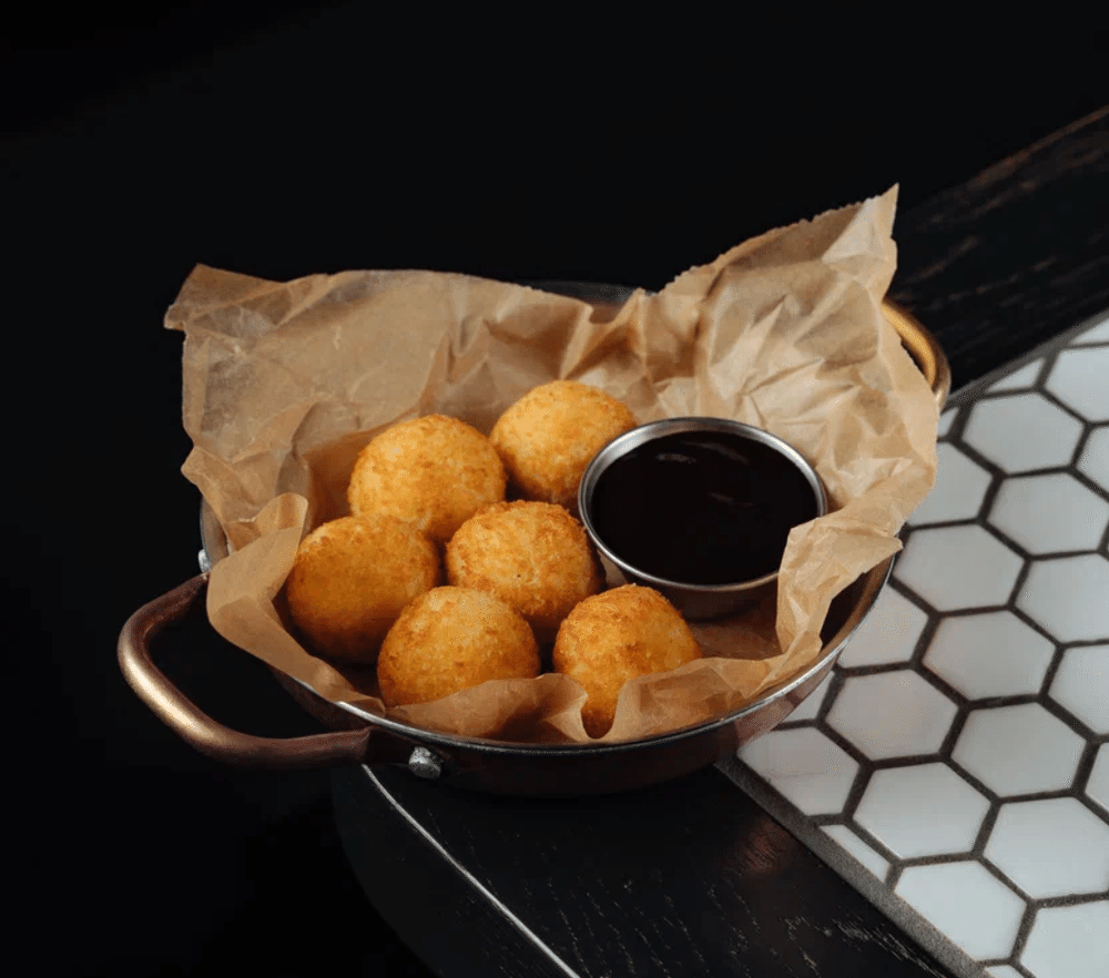 Шарики из моцареллы, фигурная панировка, соус брусничный (брусника, бальзамический крем, вишневое пиво)