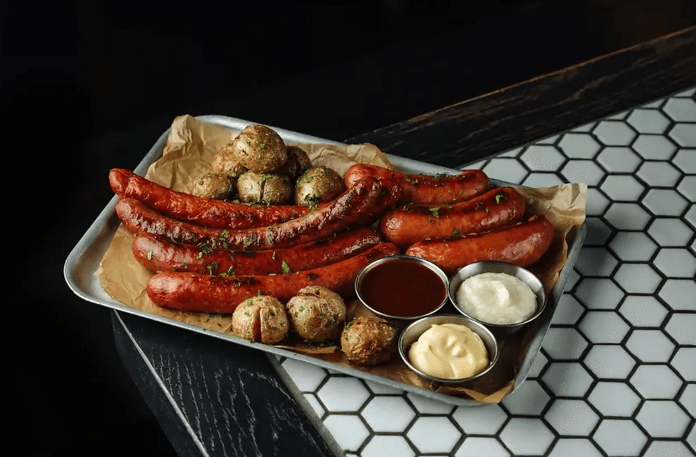 Ассорти из трех видов колбас (с сыром, пикантные с халапеньо, охотничьи), соус BBQ, соус горчичный (горчица дижонская, мед, майонез), соус сливочный хрен, запеченый мини картофель